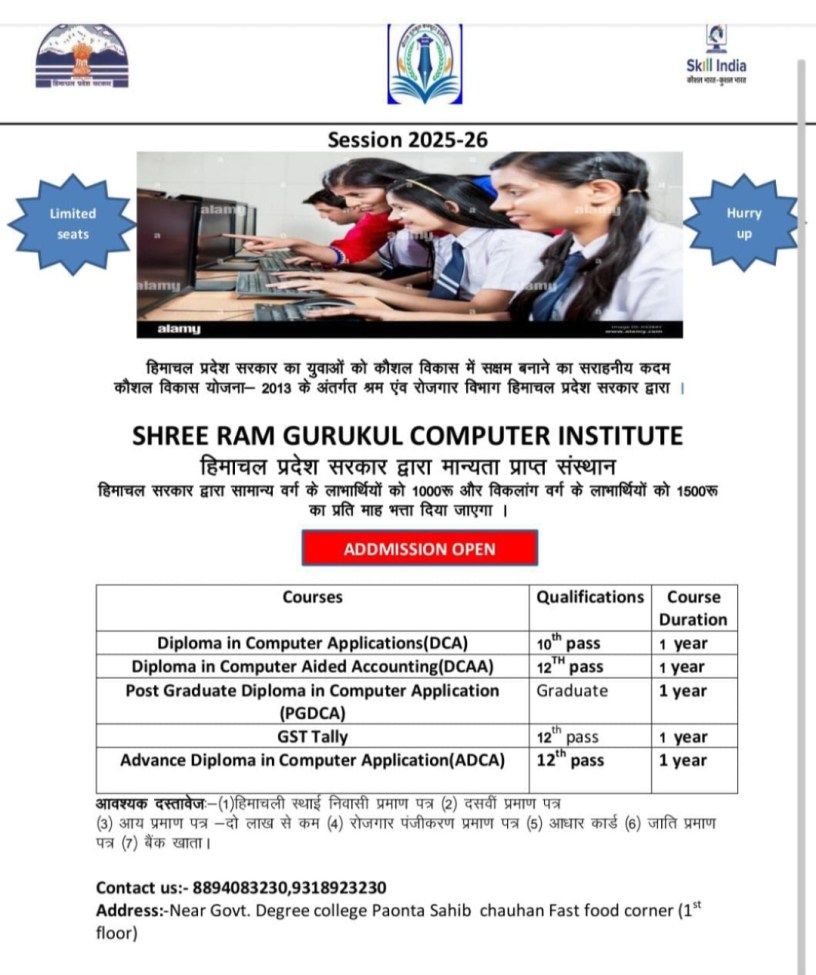 Looking for affordable, certified computer courses with job opportunities? Look no further! Join SHREE RAM GURUKUL COMPUTER INSTITUTE, recognized by the Himachal Pradesh Government under the Skill Development Scheme 2013.
